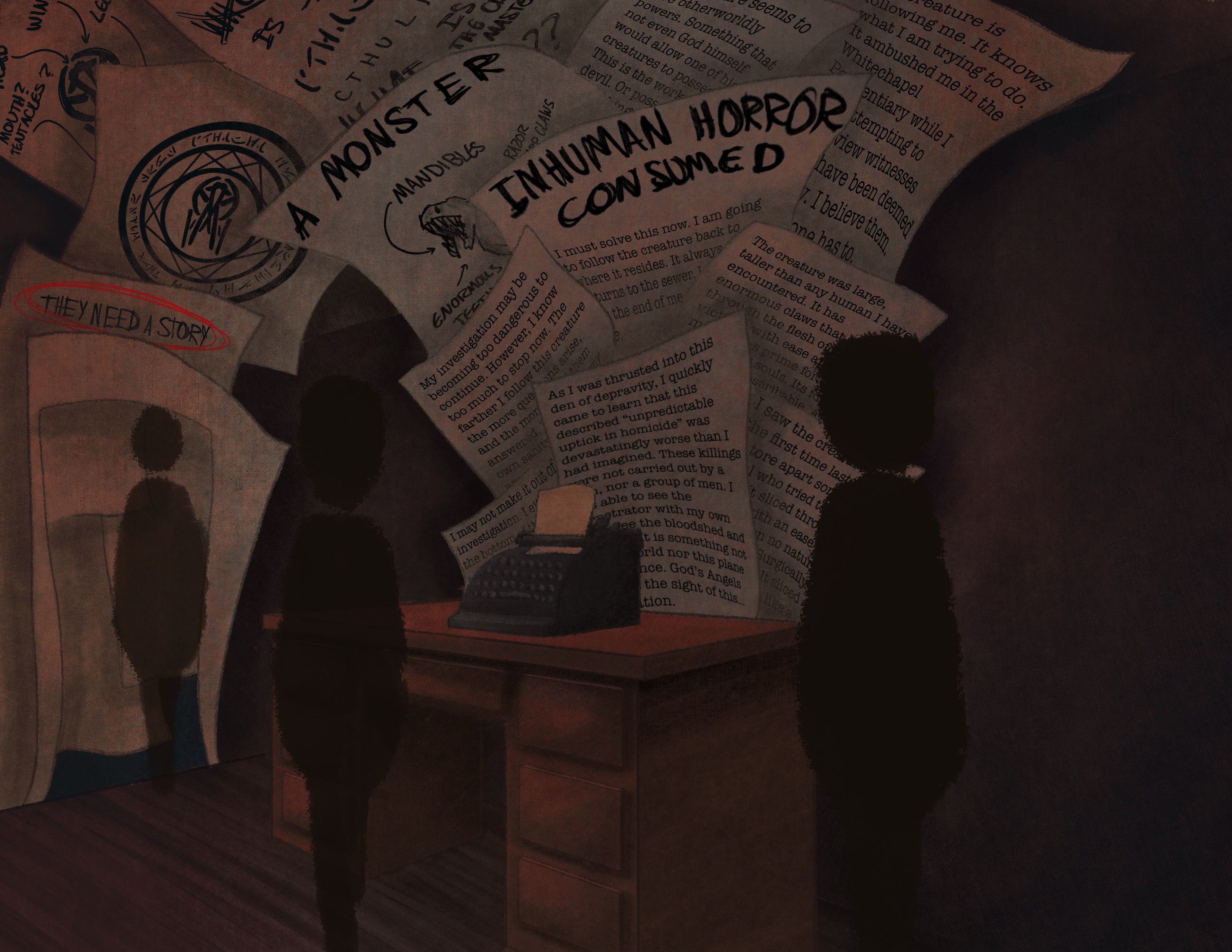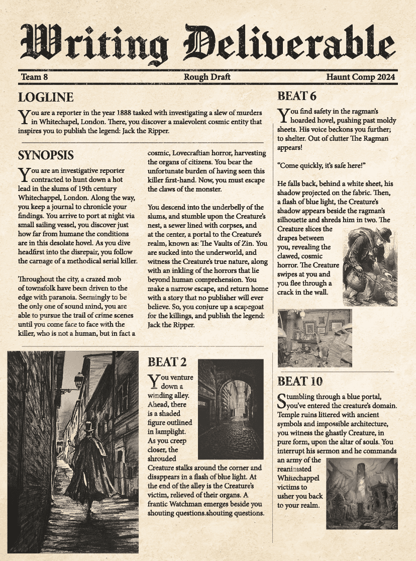 I handled the graphics and overall presentation, creating a cohesive visual language that tied the story together. I also worked with Joanna to apply text to the concept art. She created the concept art, and I warped the text and writing onto the walls to make it look like it was part of the paper clippings. Together, we developed the glowing graphics and other visual elements to enhance immersion and reinforce the narrative for guests.