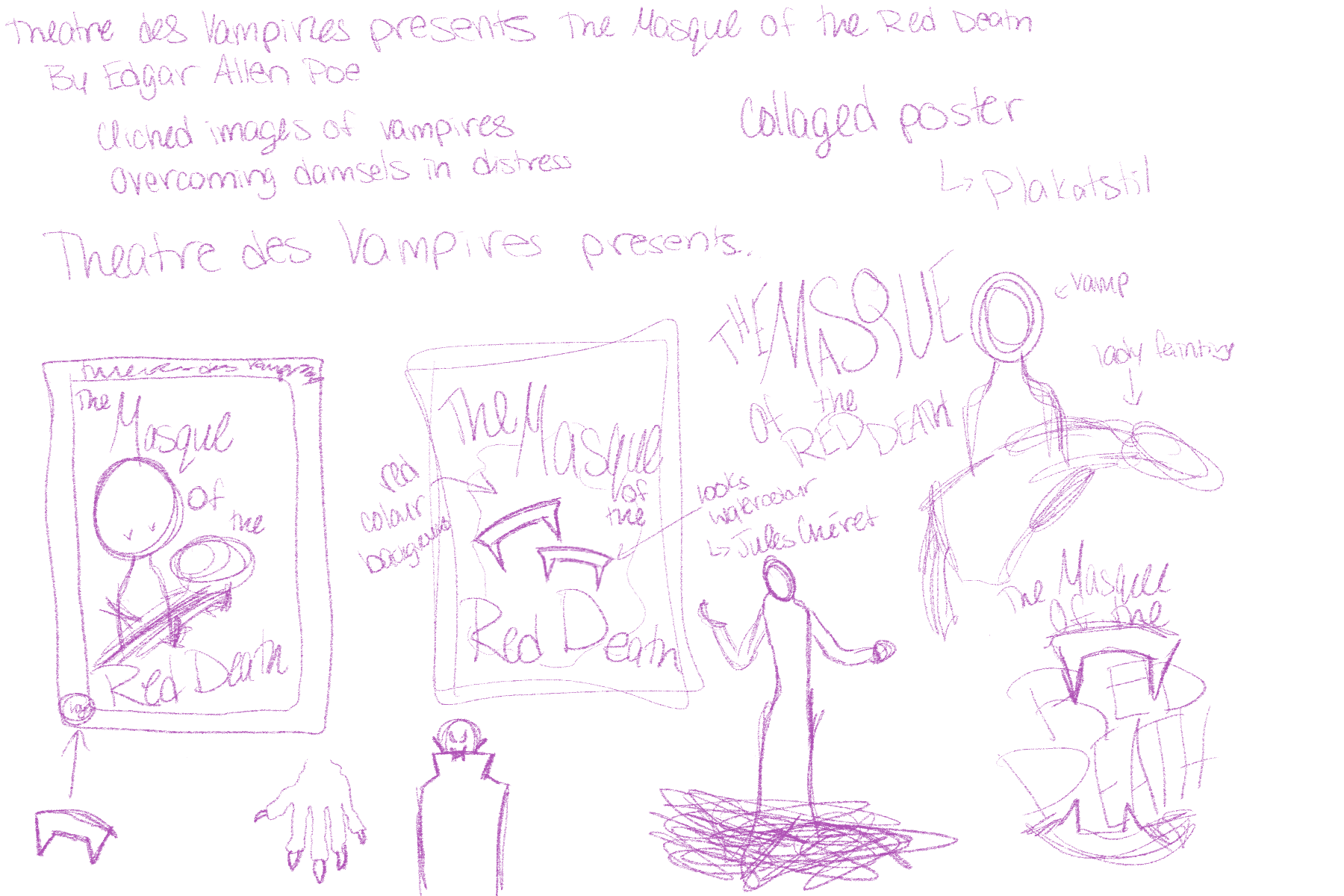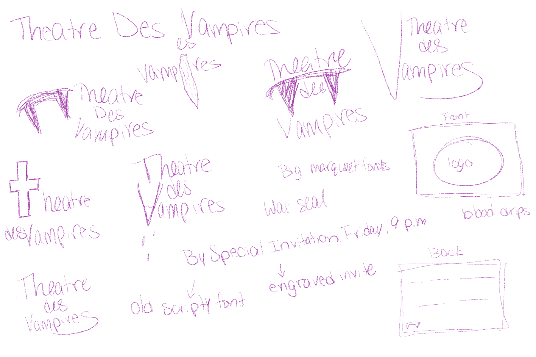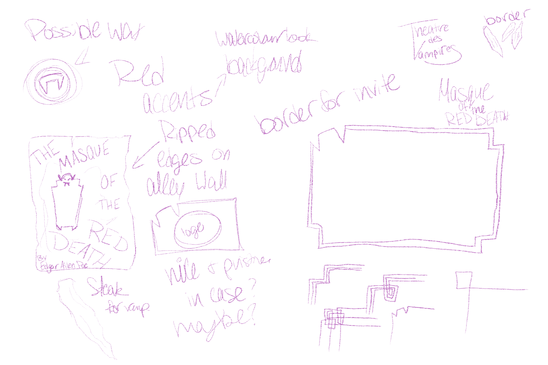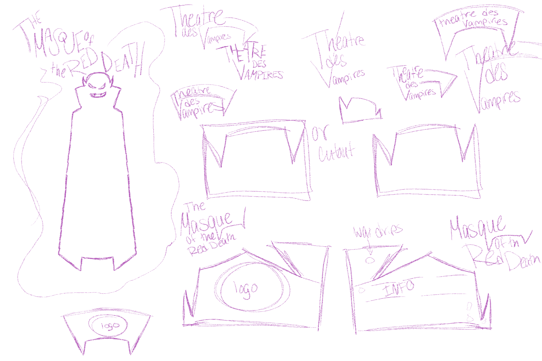 I began by researching late 1800s posters, focusing on works by Jules Chéret and past designs for Masque of the Red Death. This helped me understand the era’s typography, color palettes, and visual approaches, as well as the mood and tone needed to reflect the play. I then sketched logos for the theatre and created thumbnails for the poster and invitation layouts, keeping the period and setting in mind.