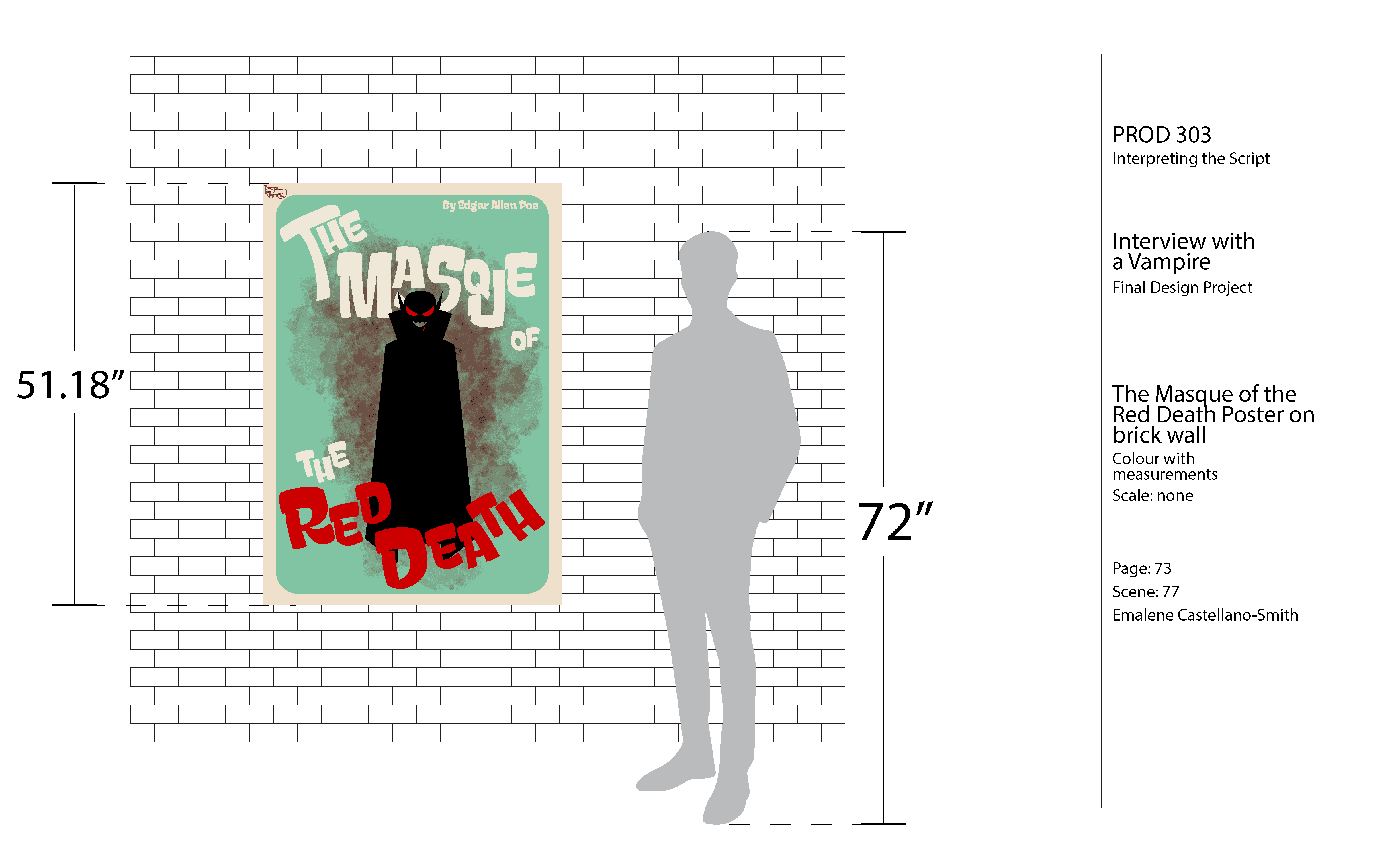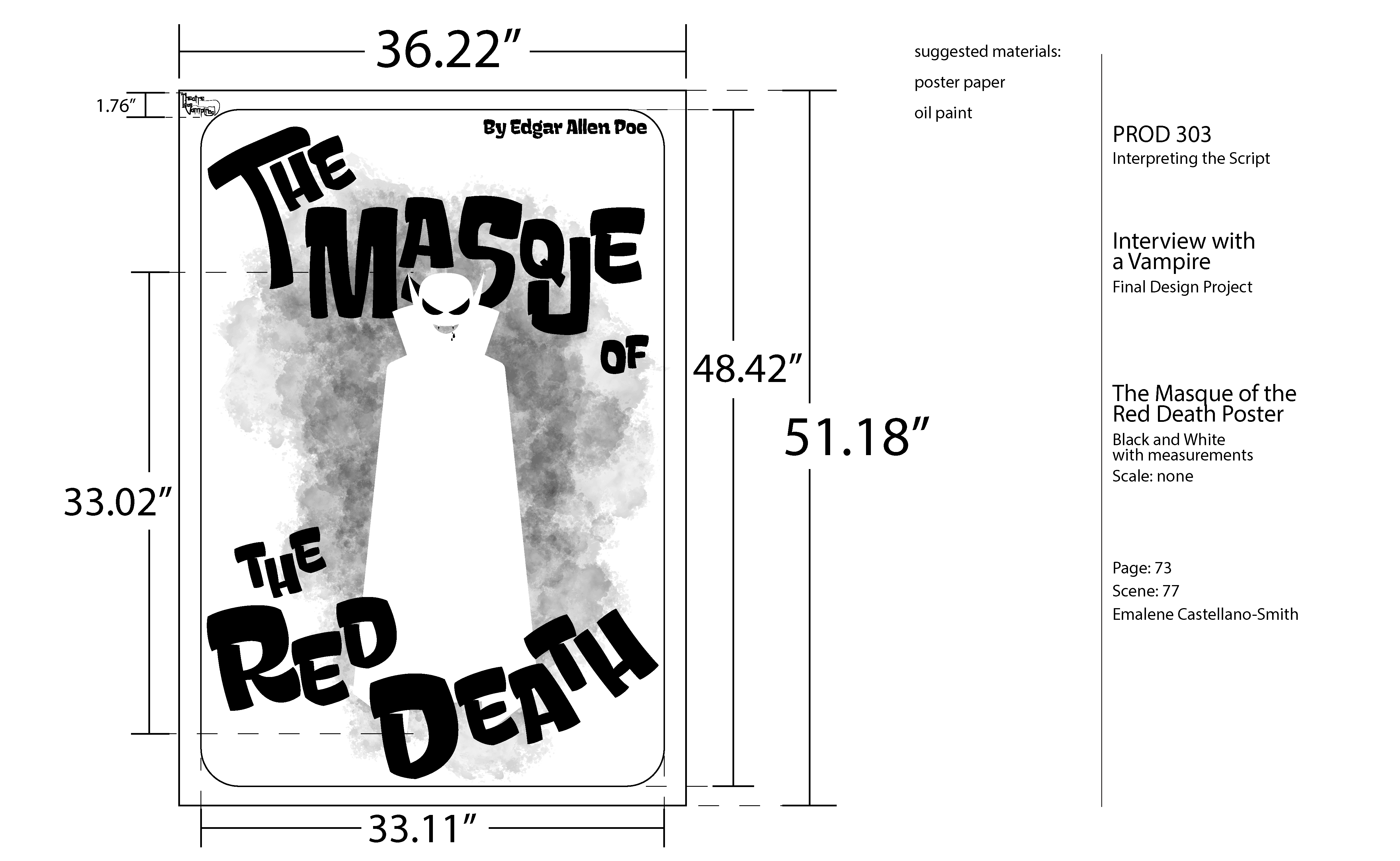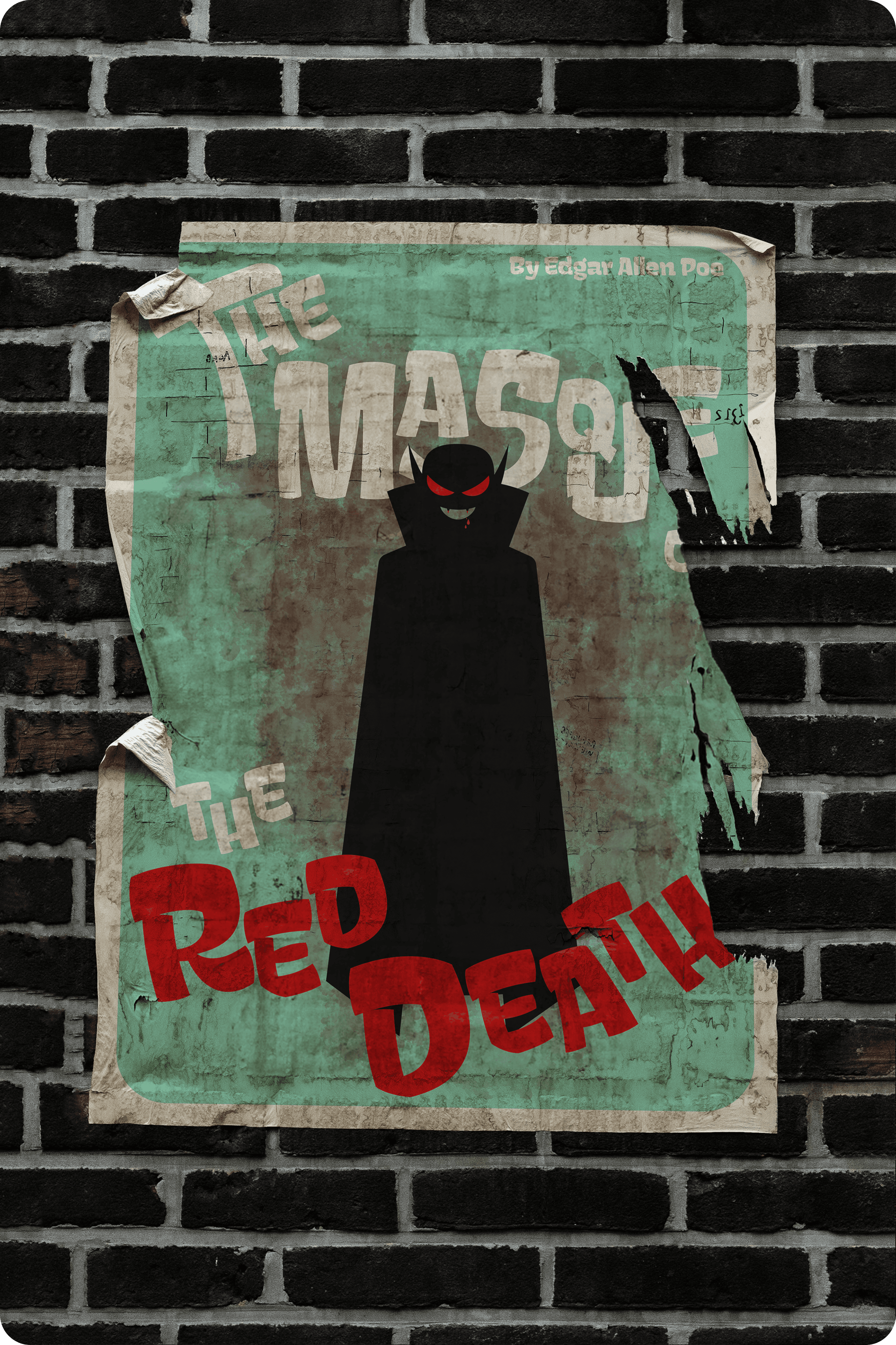 The second piece is a poster for The Masque of the Red Death, the production staged at the theatre. Here, scale and hierarchy heighten drama, with bold title treatment and shadowed forms creating visual weight. The design balances grandeur and decay, reinforcing the theatrical spectacle while foreshadowing the darkness behind the curtain.